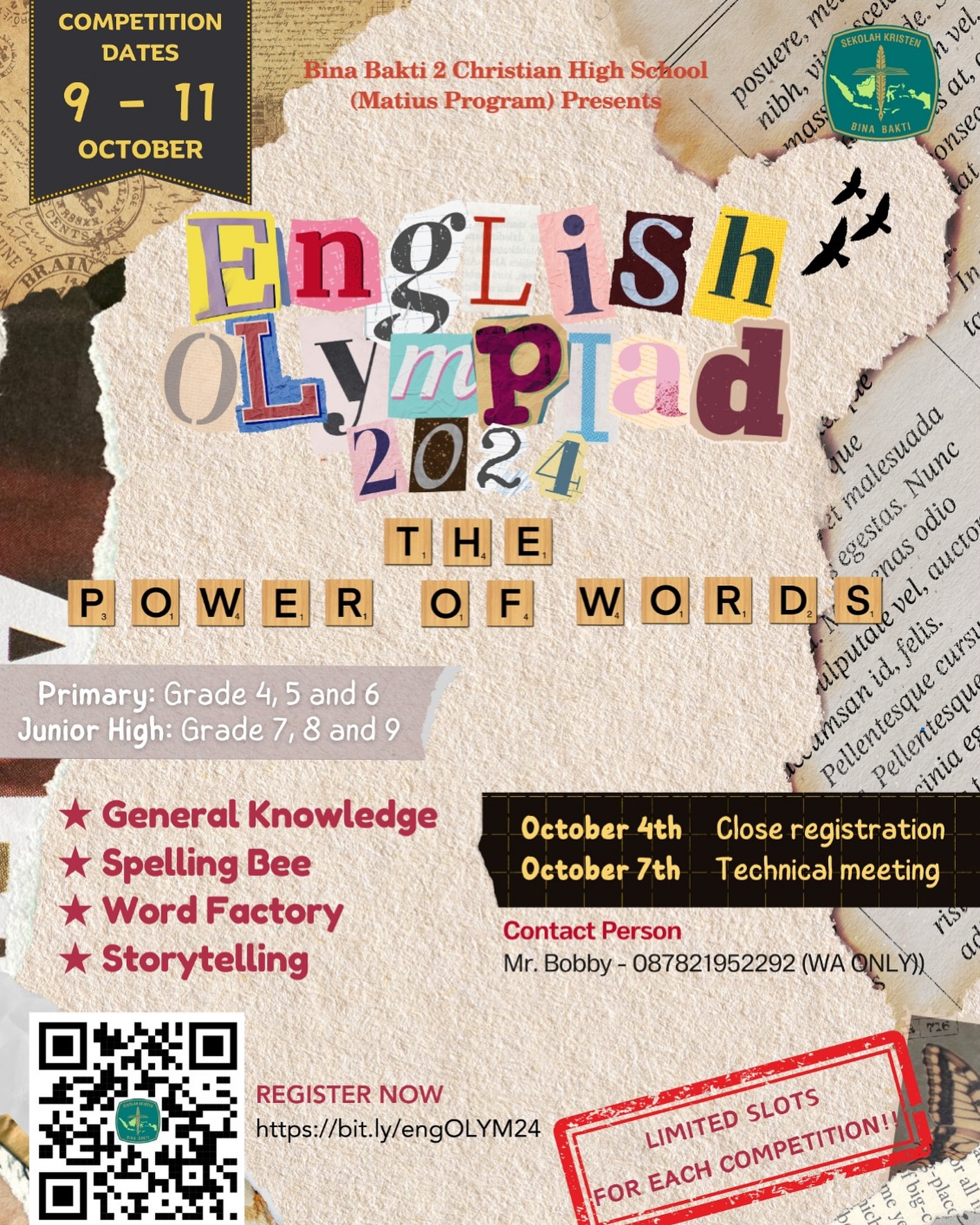 bisa buruan daftar di *English Olympiad 2024* yang diadakan oleh Bina Bakti MATIUS 😎